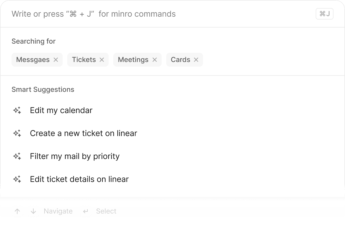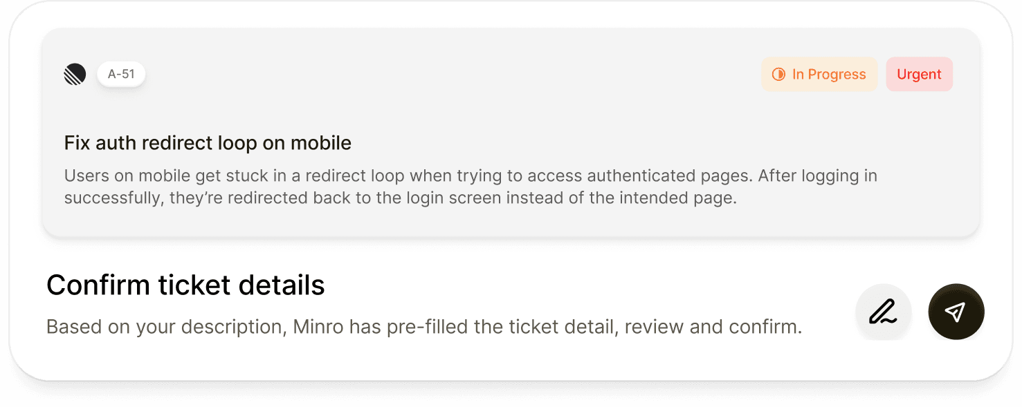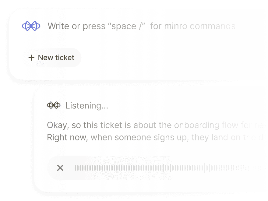Creating tickets shouldn’t be work. Press Cmd+J, speak or type, and Minro creates a fully-formed, contextual ticket—formatted, tagged, ready.
